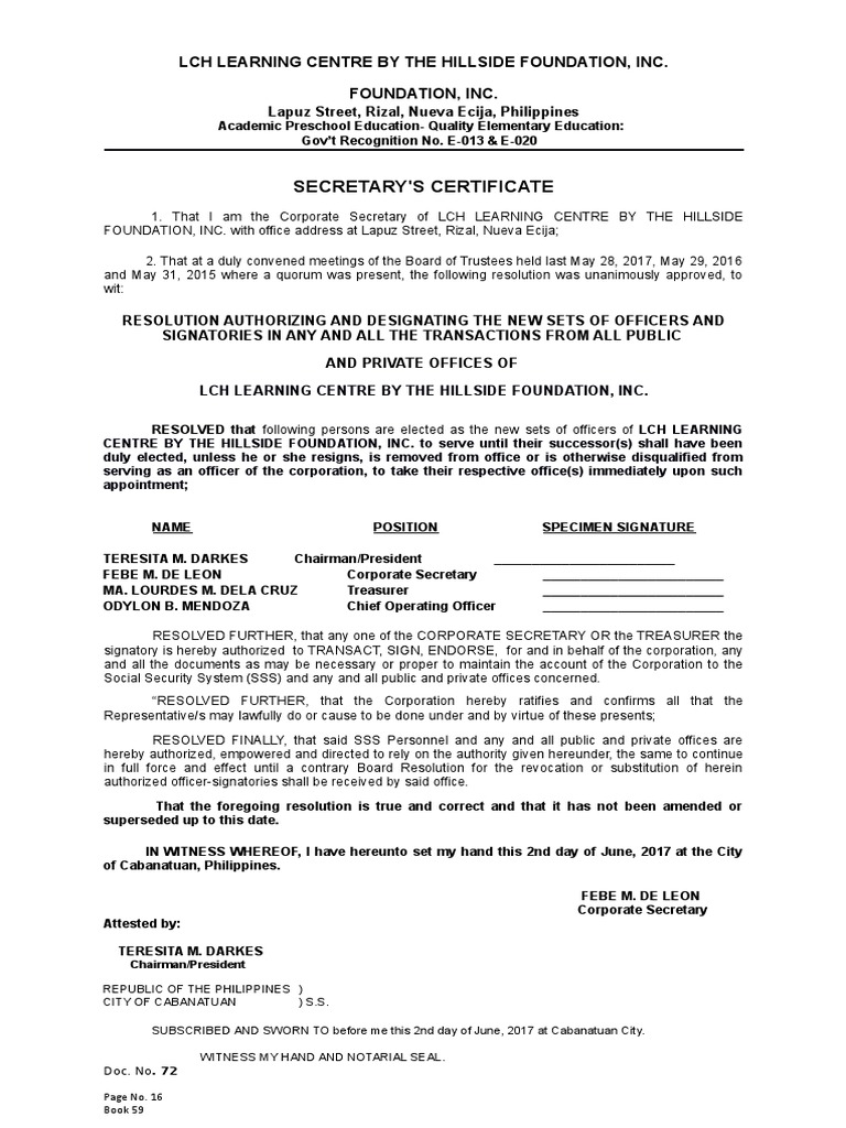 Secretary S Certificate To Open Account Cheque Deposit